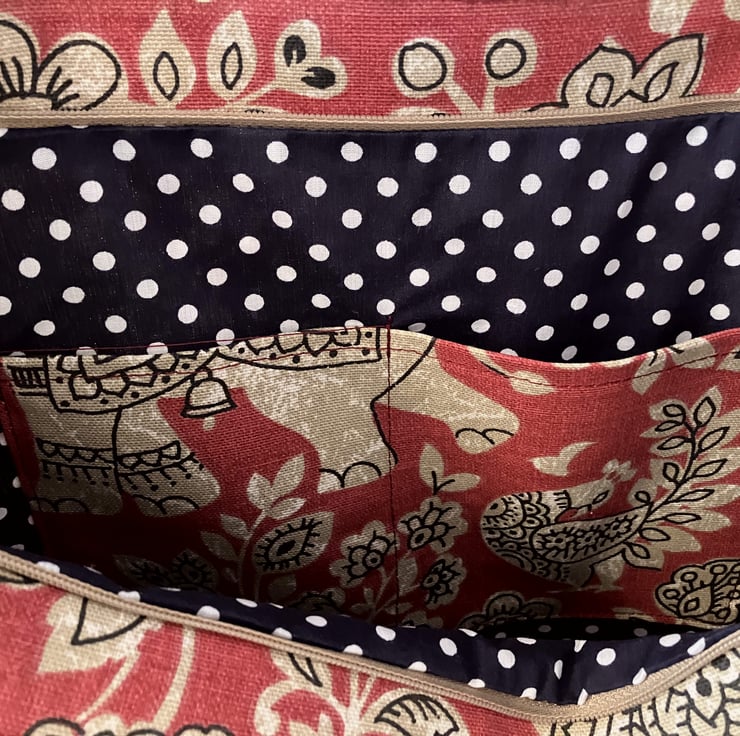 A handmade 100% cotton Tote Bag made from this fabulous Indira Elephant fabric lined with a navy polka-dot cotton lining. I have put a full length zip at the top to keep your belongings secure and there is an inside pocket which is split in two. The bag has a flat bottom and stands approx 10.5ins (27cm tall and 16ins (40cm) wide with a base of 4ins (10cm).