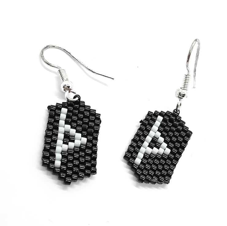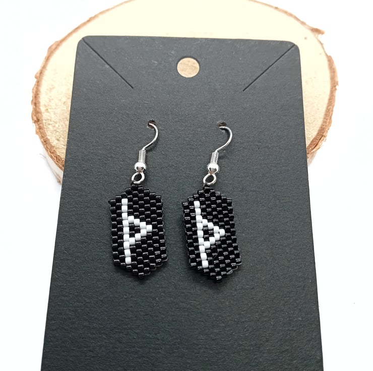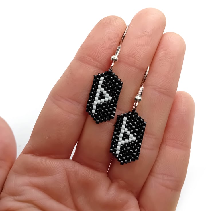 These Thurisaz viking rune beaded earrings have been created using black and white delica beads, beading thread and silver plated ear wires.