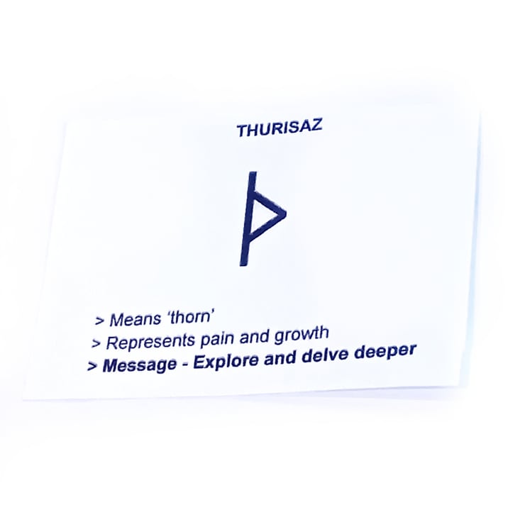 Thurisaz (pronounced thor-ee-saws) means 'thorn' and represents pain and personal growth.