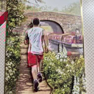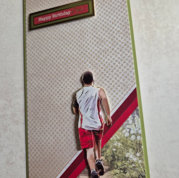 The card shows a runner jogging along a path in the countryside. This card can be used for someone who likes to get out for a jog in the fresh air or is in training for a marathon. The jogger is made up of 2 layers of die cut decoupage. The greetings topper has the words Happy birthday to you. The insert is blank for your own greetings. The underside of the insert has the treads of running shoes.