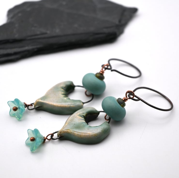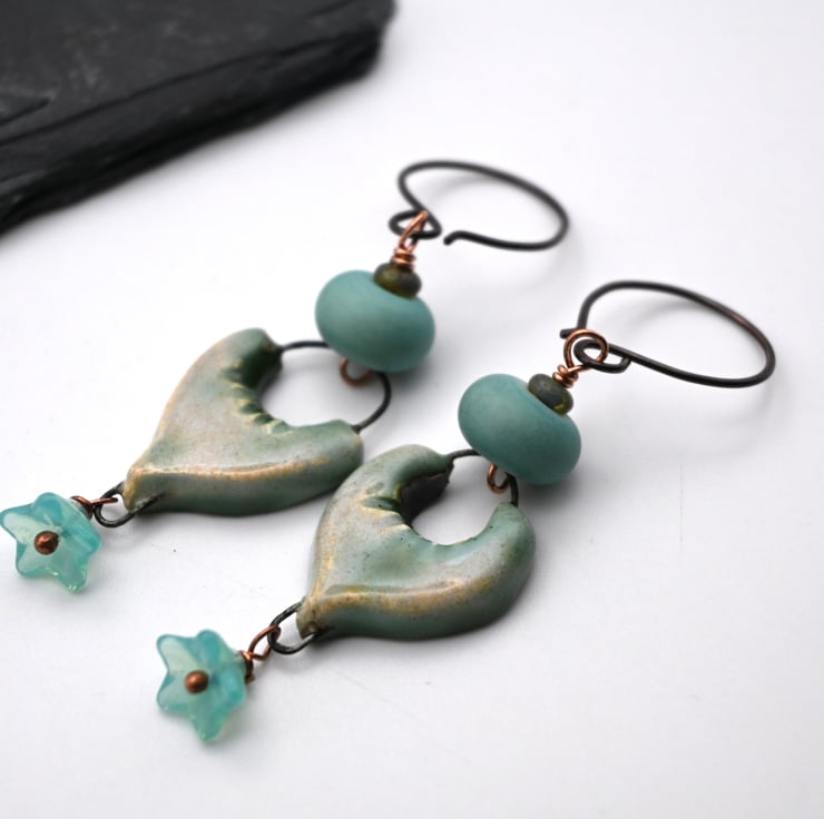 A pair of copper earrings which feature pale green lampwork glass beads, ceramic connectors and small glass flowers.