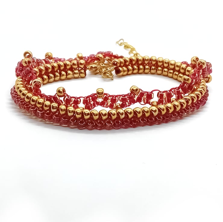 The bracelets have been made using a combination of herringbone stitch and ladder stitch.