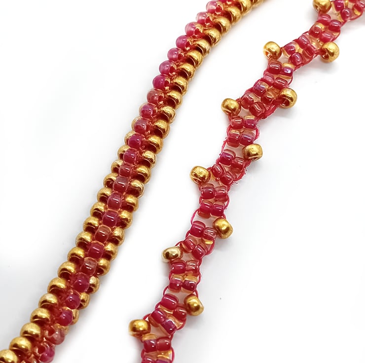 One is a sleek double band of beads and the other is a ladder stitch zig zag pattern, both in gold with pink beads.