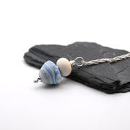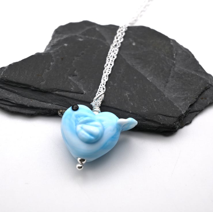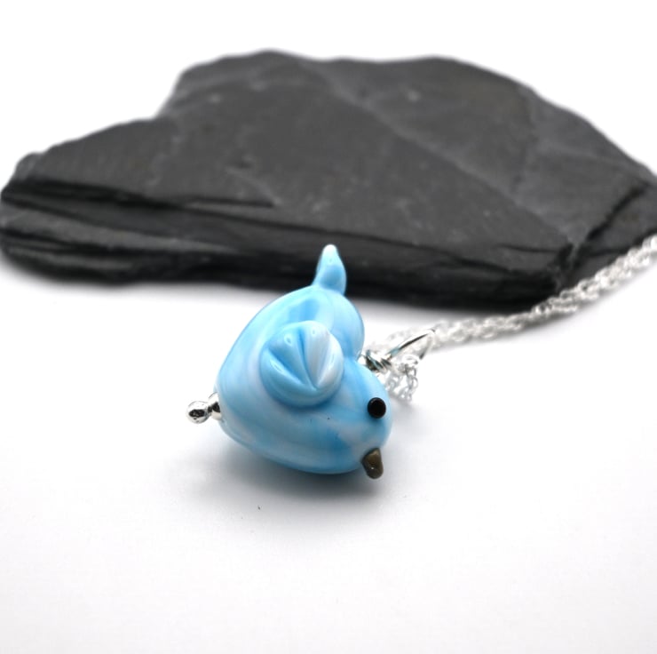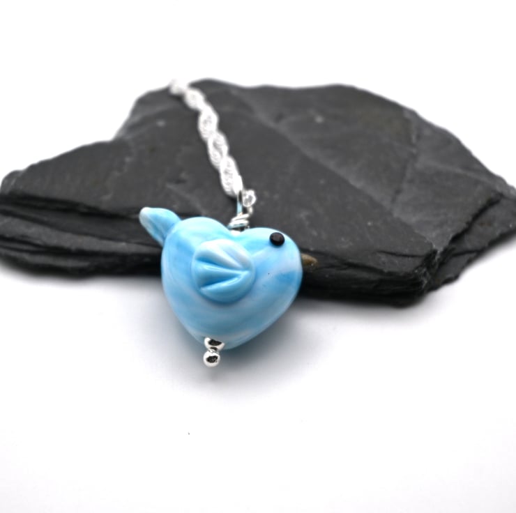 A sterling silver chain which features a handmade lampwork glass blue bird pendant.