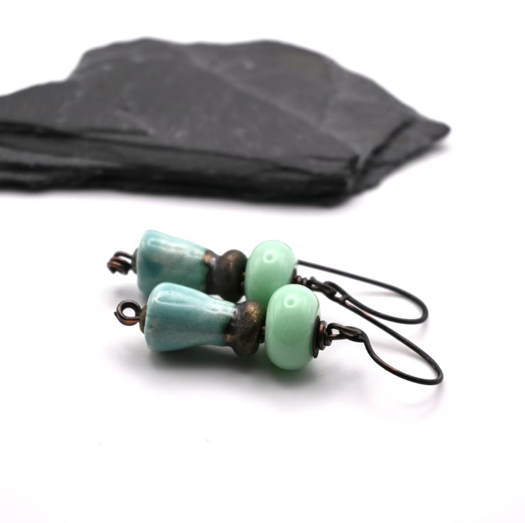 A pair of copper earrings made with handmade lampwork green glass beads and ceramic tube beads.