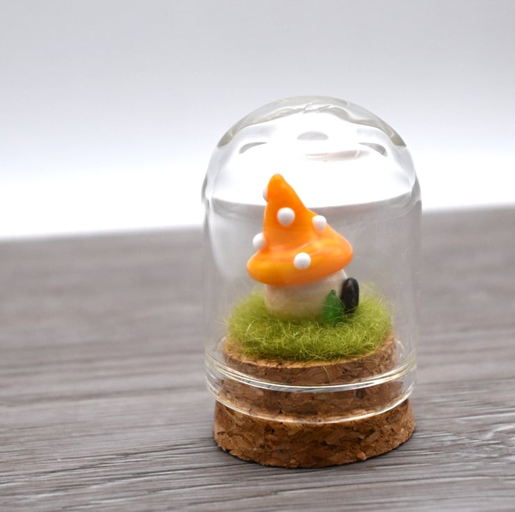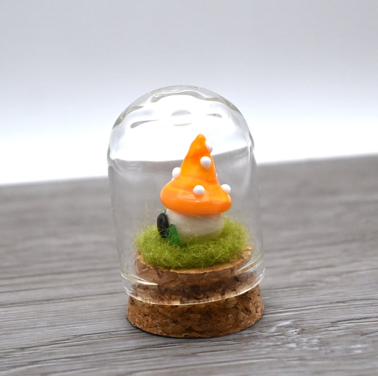 It features green fibre and a handmade lampwork glass toadstool fairy house.