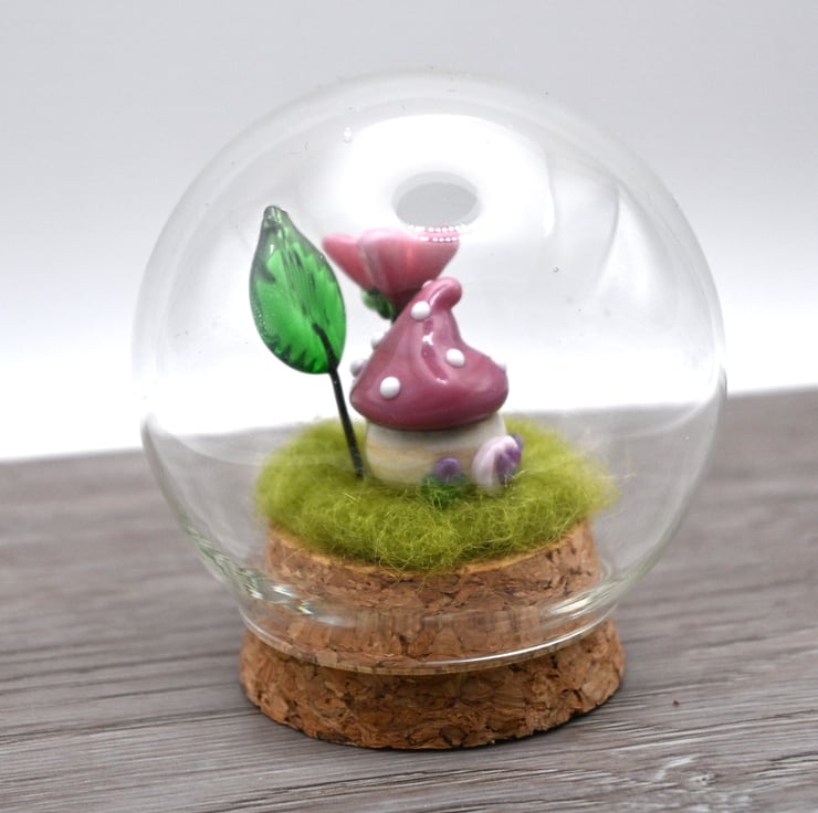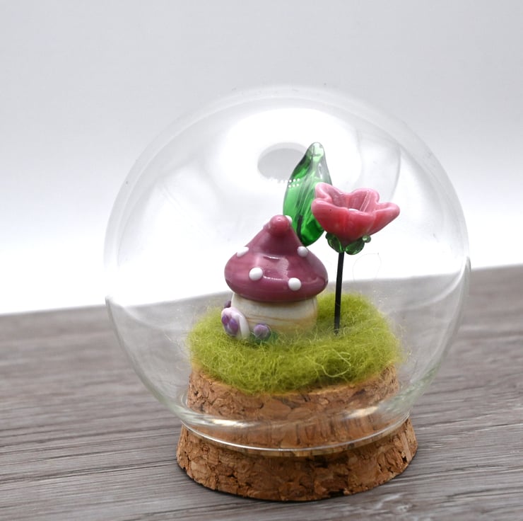 It features green fibre and a handmade lampwork glass toadstool fairy house, pink lampwork glass flower and a green lampwork glass leaf.