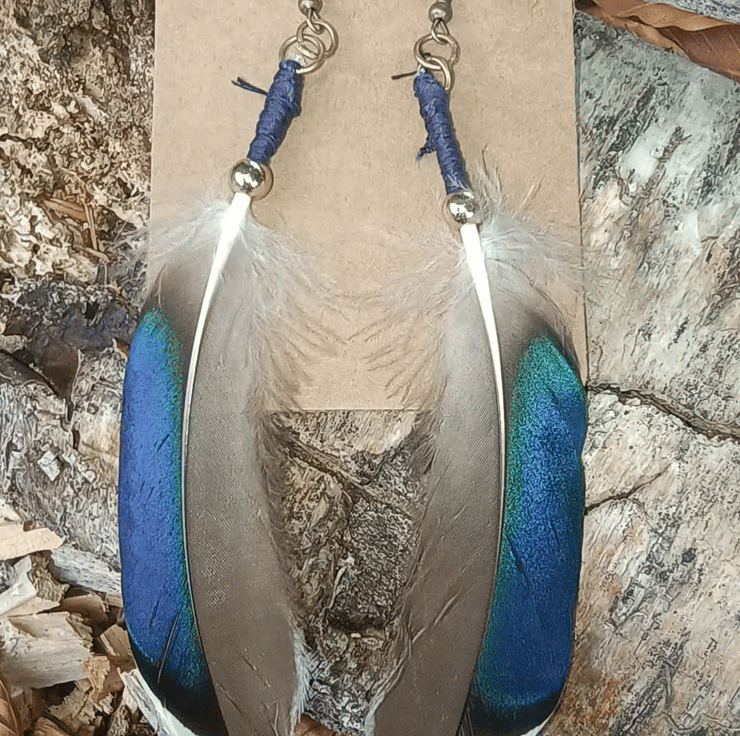 This listing is for a one-off pair of handmade feather earrings crafted with iridescent blue green and grey duck feathers, cloudy royal blue beads and little gold ball beads on a vintage gold-coloured hook.