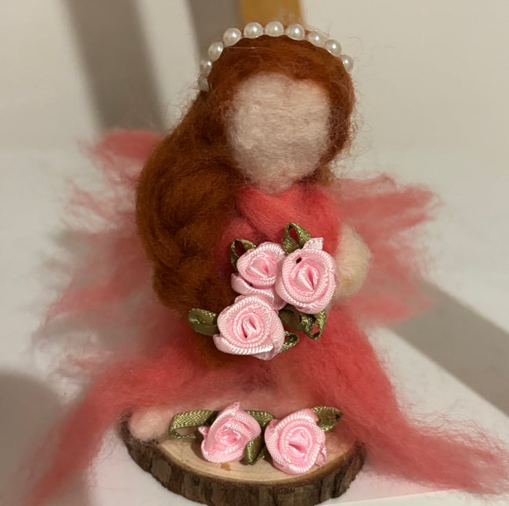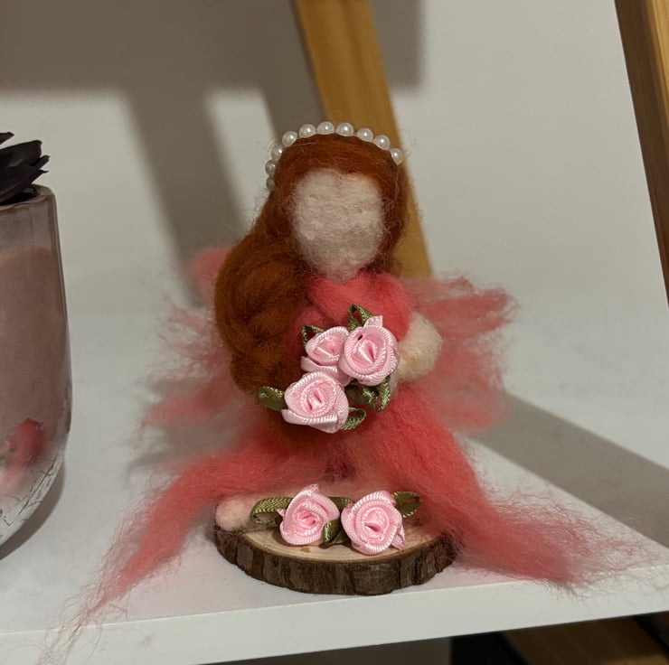 Small felted fairy sitting and picking her flowers. A reminder to smell the roses in life. Handmade with love.