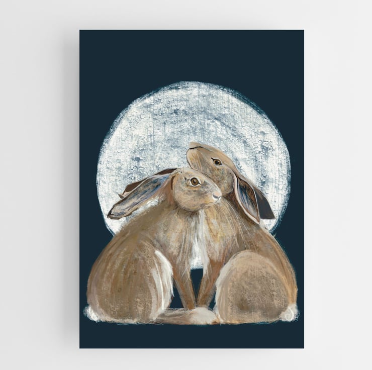 The hares meet under the moon a perfect romantic spot. Perfect for sending out a special greeting to a friend or partner. Many people buy this card as anniversay or valentine cards when they don’t want a greeting on the front just a piece of art that makes them think of love