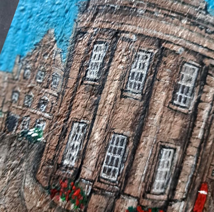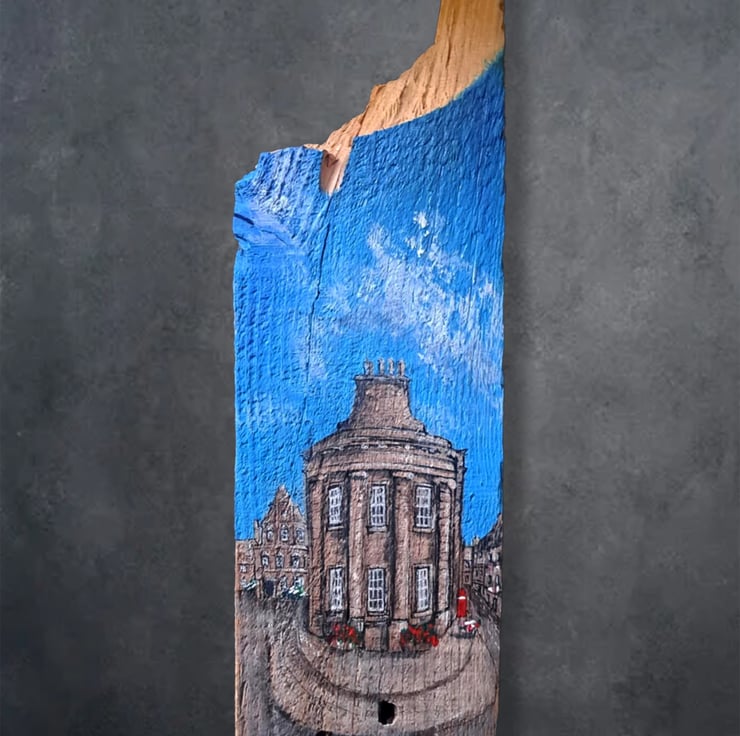 A unique tribute to the historic County Hall, painted on raw, salvaged wood. A perfect blend of Scottish history and rustic, eco-friendly art.