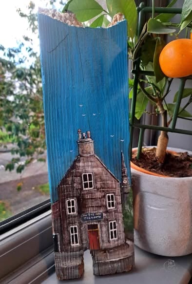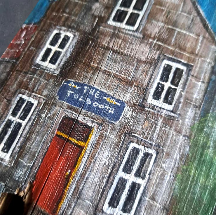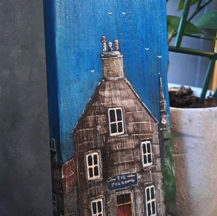 A handpainted,unique tribute to 'The Tolbooth' pub in Forfar. Painted on raw, reclaimed wood, this piece blends Scottish local charm with a rustic, sustainable aesthetic.