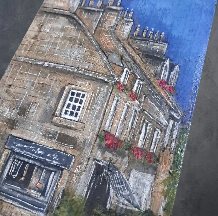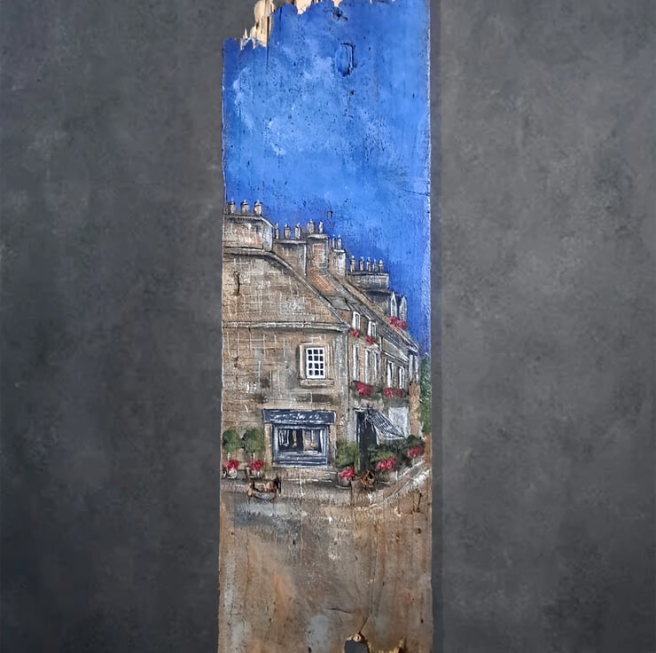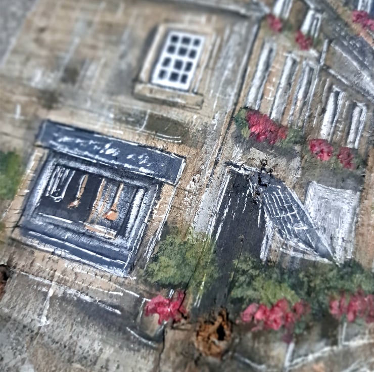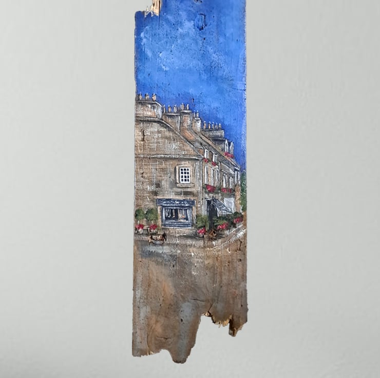 Hand-painted look at a classic St Andrews pub on a raw timber plank. It features the traditional storefront and signage, using the natural wood grain to give the building an authentic, weathered feel.