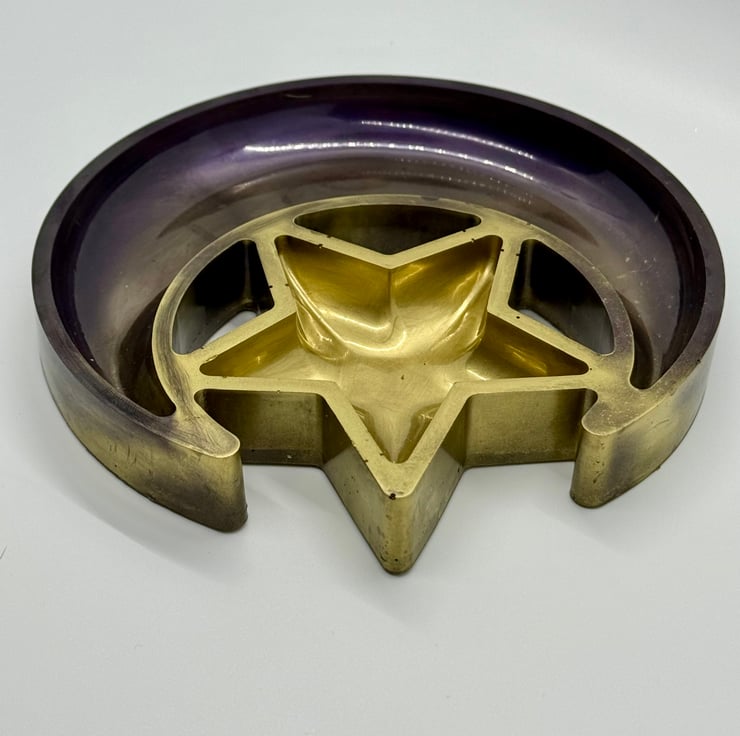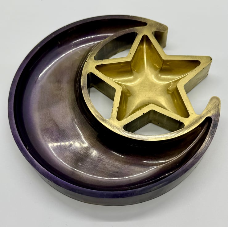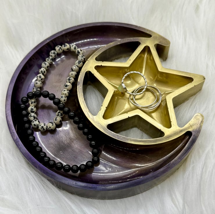 Made from resin, this jewellery or trinket tray has a golden star swirled into a deep purple metallic moon.