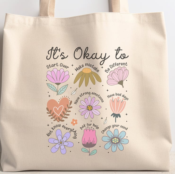 This beautifully designed tote bag features the uplifting “It’s Okay to Be” quote with colourful floral illustrations, celebrating self-care, kindness and everyday courage. Made from durable polyester, it’s lightweight yet strong — perfect for shopping, work, books or daily essentials.