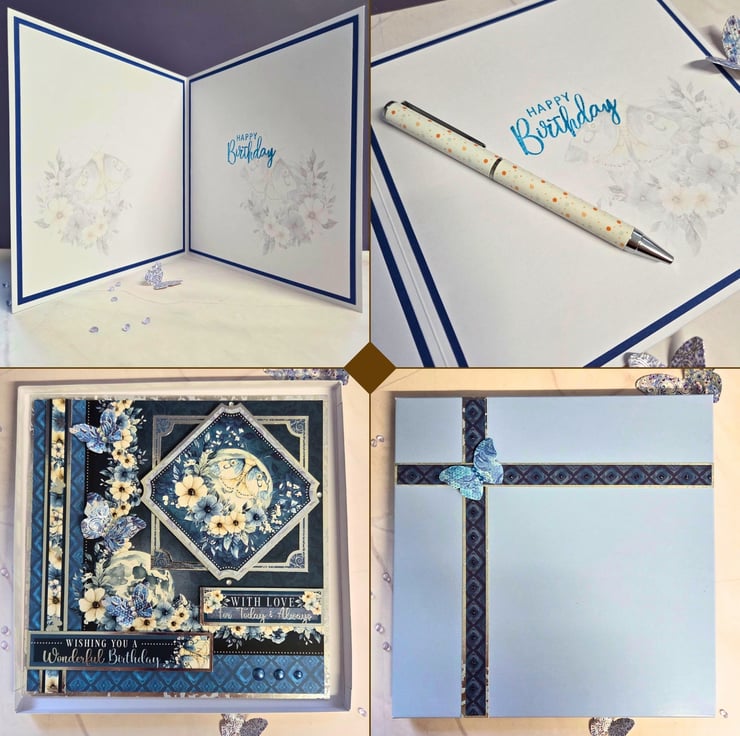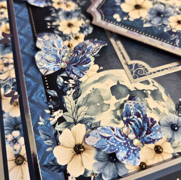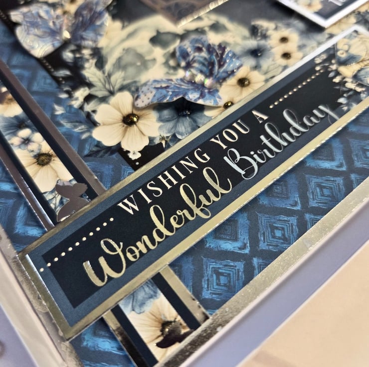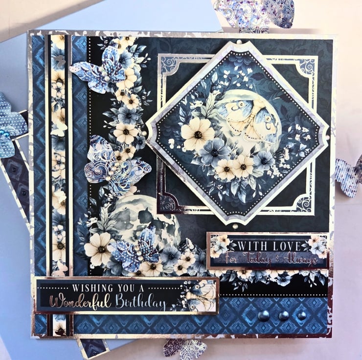 Made of a white card base layered with silver mirror card & deep blue cardstock, printed with a floral border. The main image is surrounded by a matching frame & features a butterfly in front of a floral moon. The sentiments "With Love For Today & Always" & "Wishing You A Wonderful Birthday" are laying under the main image, with a decorative floral strip embellishing the left side of the card. Finished with 3 dimensional butterfly embellishments, small craft gemstones & matching colour drops. The card's luxurious feel carries on to the inside, with a matching insert panels on both sides, layered with blue card. On the right, the sentiment "Happy Birthday" is stamped in blue, decorative font.