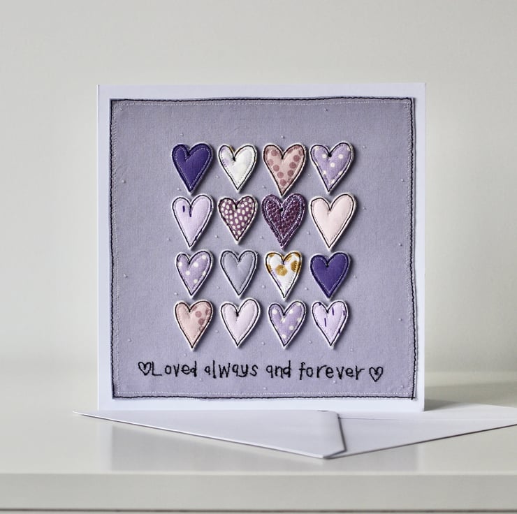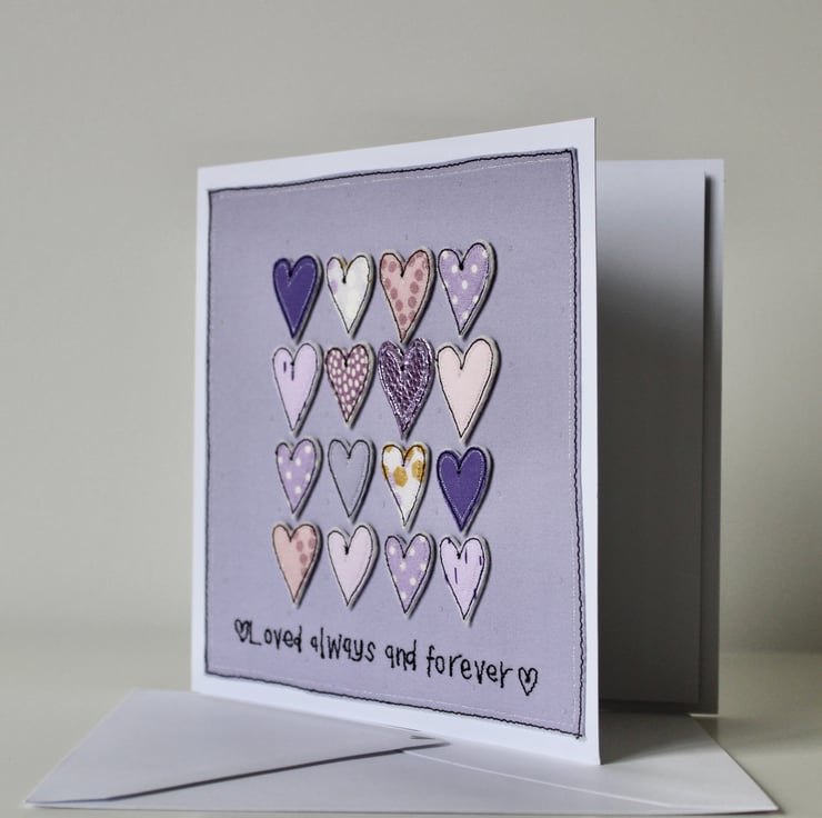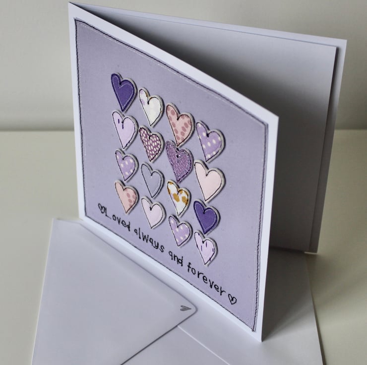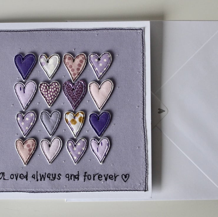 A handmade card which includes sixteen hearts and the stitched words 'Loved always and forever'.