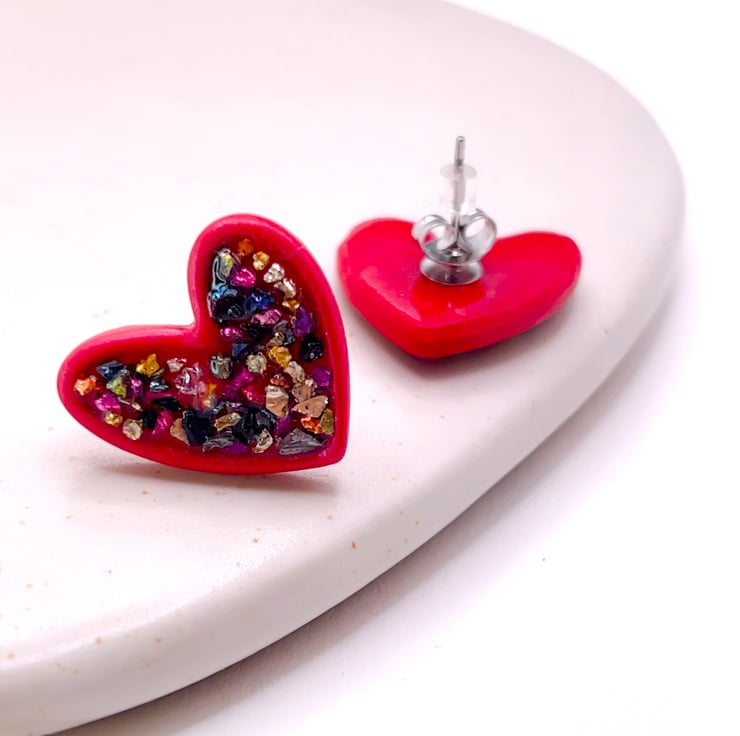 Handmade heart-shaped stud earrings made from premium polymer clay.