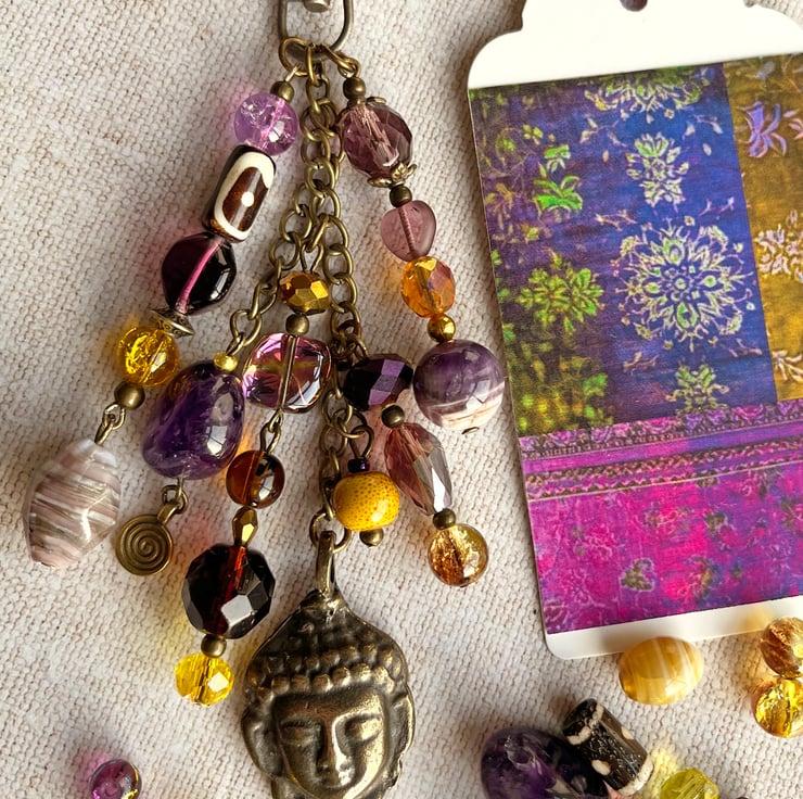 This handmade bag charm with its cascade of pretty beads would add a boho-glam vibe to any bag. It is perfect for anyone with a February birthday as I've added some amethyst beads which is the birthstone for February.
