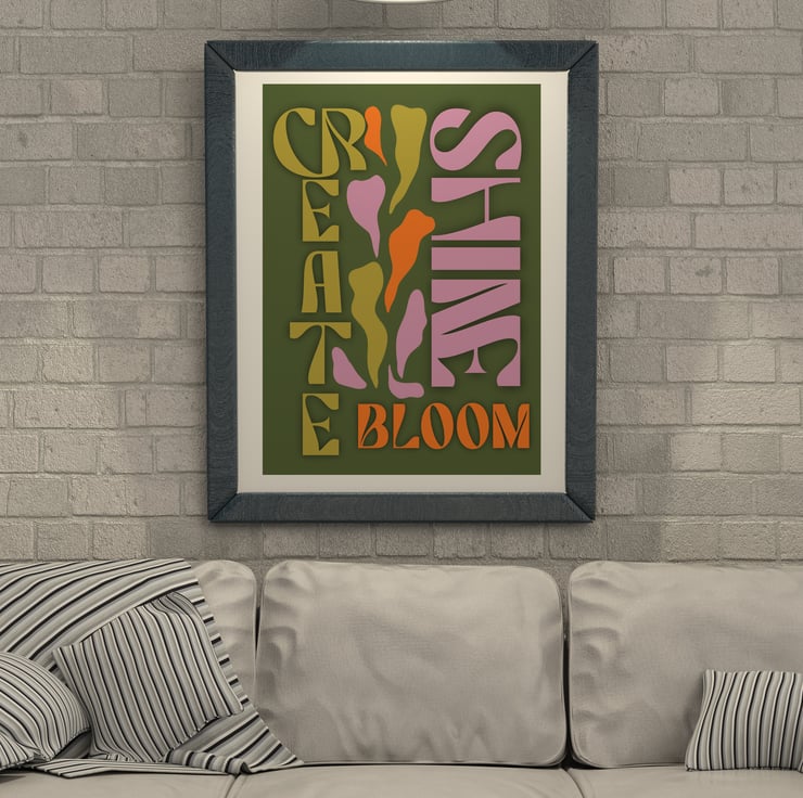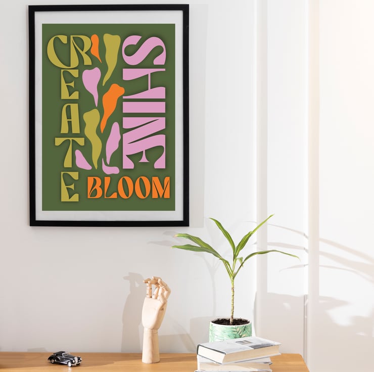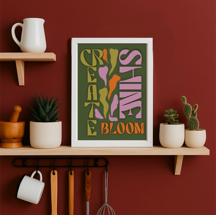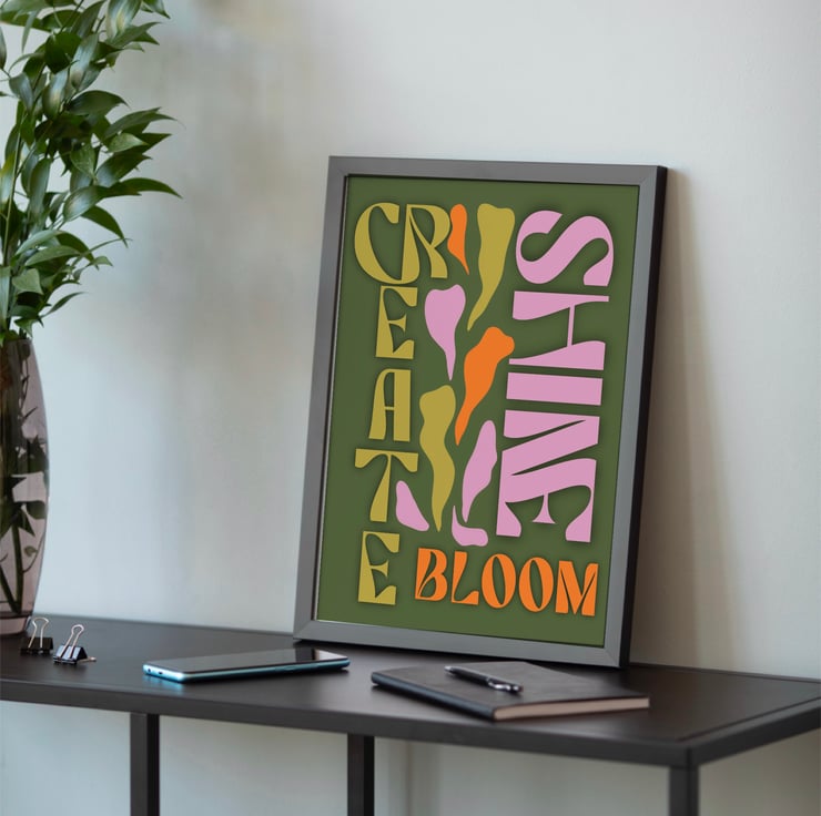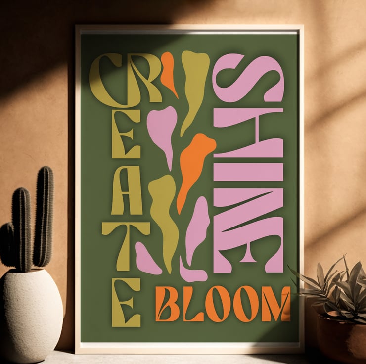 Brighten your space and your mindset with this Create, Shine, Bloom motivational art print – a joyful, chic and colorful statement piece designed to lift your mood every single day.
