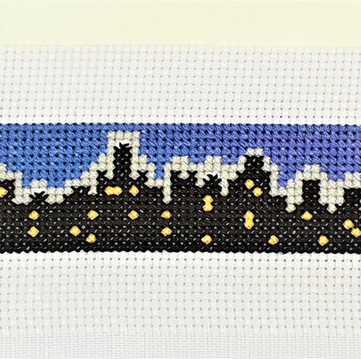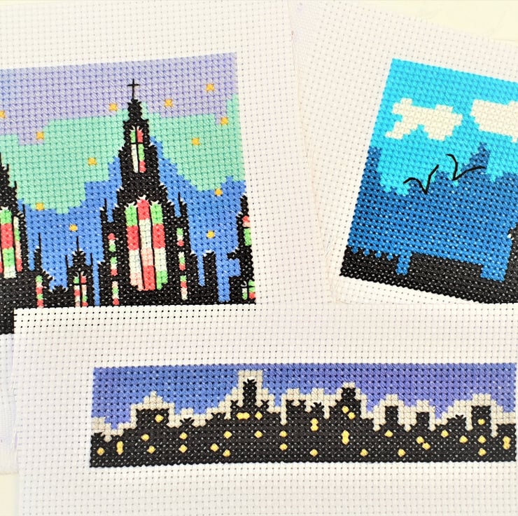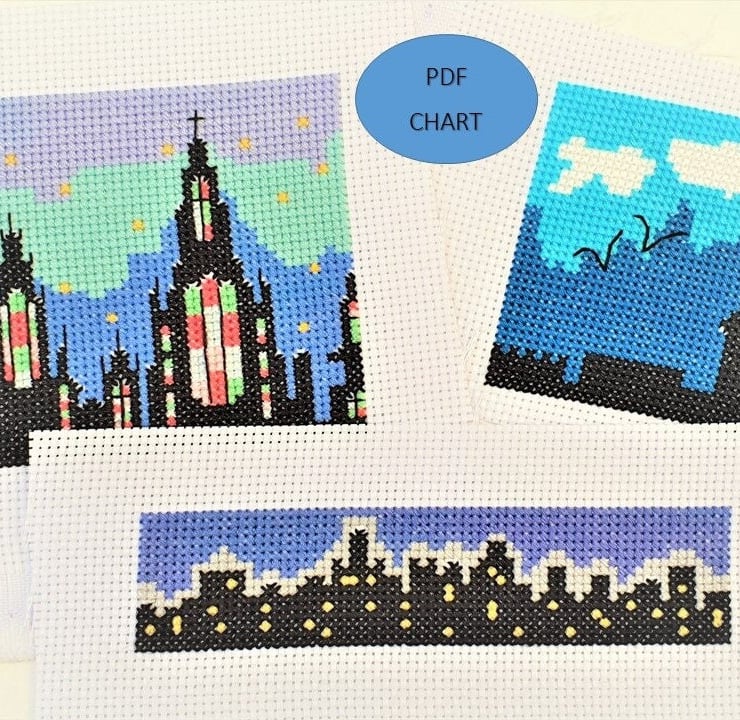 Set of 3 original designs of city style skylines cross stitch charts in PDF format for instant download.