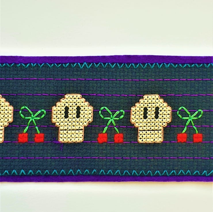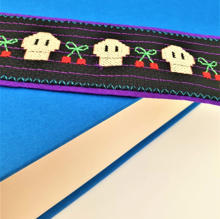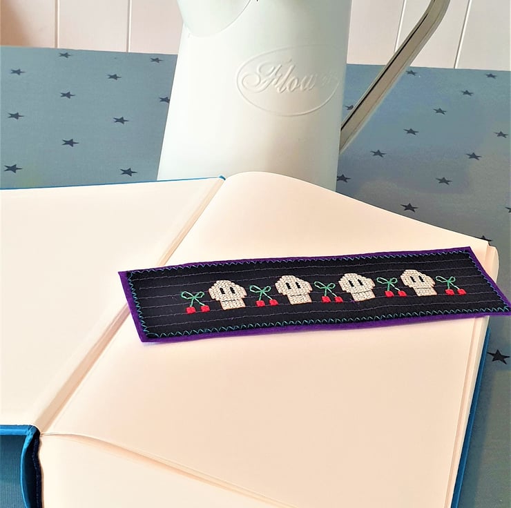 A cross stitch handmade bookmark with an original skull and cherries design.