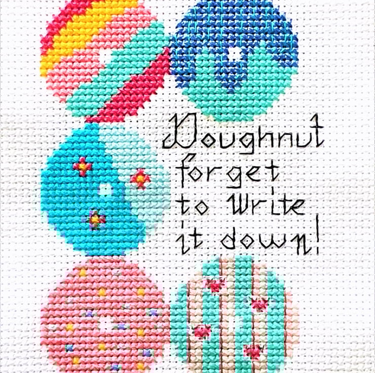A cross stitch chart of colourful Doughnuts with "Doughnut forget to write it down" quote in PDF format for instant download.