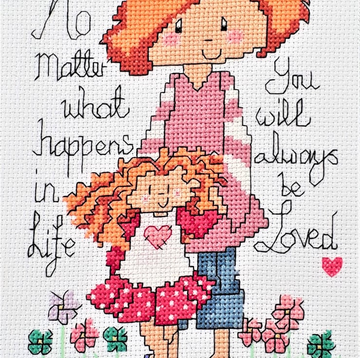Original cross stitch chart design of a Mother and her daughter in PDF format for instant download.