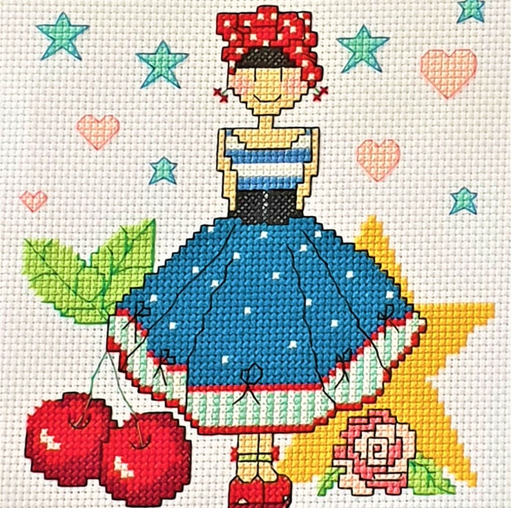 Original cute cross stitch chart design of a Rockabilly style girl with cherries, stars, hearts and floral detail in PDF format for instant download.
