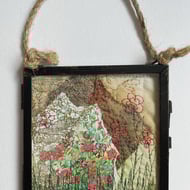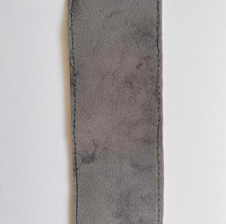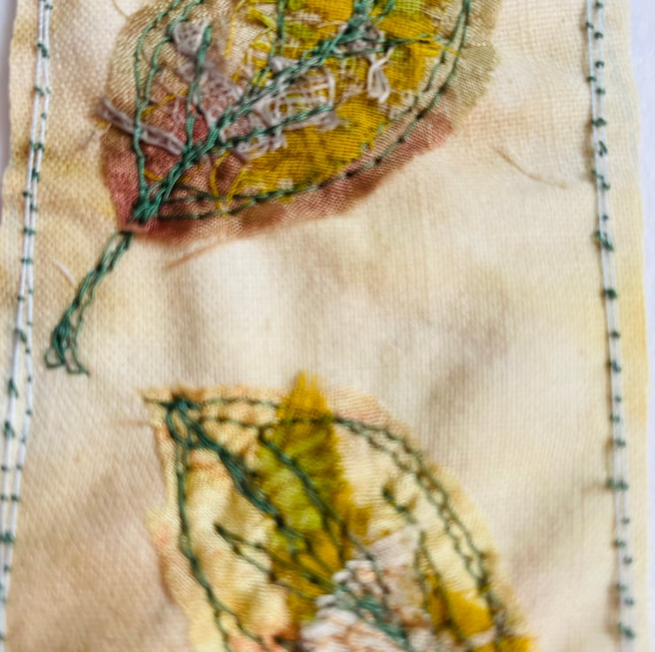 This particular bookmark has been inspired by the autumn leaves and the changes in colour which they have as they go through the season. A combination of naturally dyed silk, lace and organza for the different tones of green, yellow and orange within the leaves as well as being outlined with green stitch. The bookmark has been backed onto a piece dark grey swayed fabric.