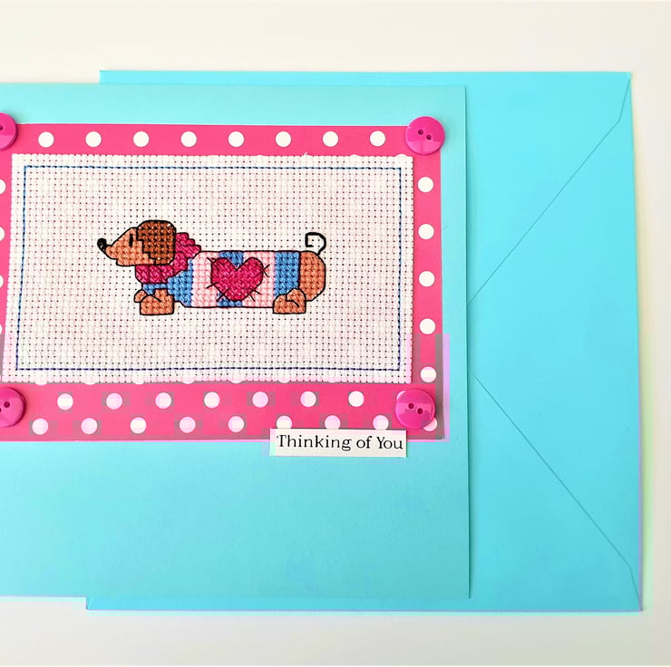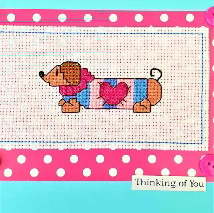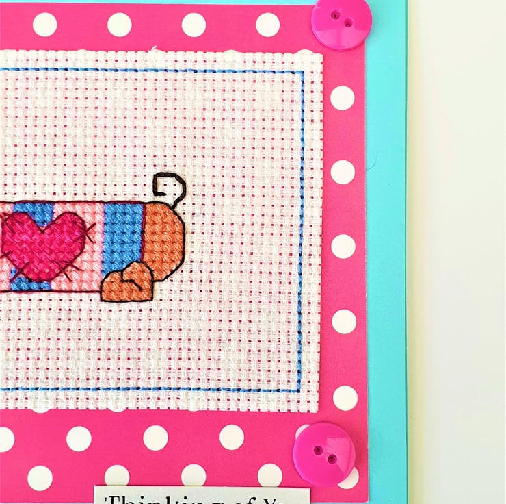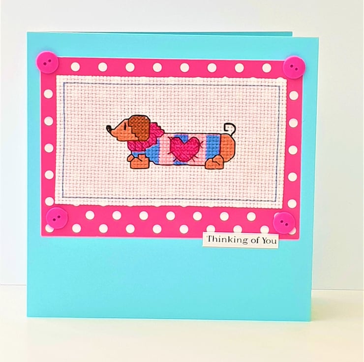 A hand made card, featuring an original cross stitch design of a Daschund/ Sausage Dog in a jumper and the wording "Thinking of you".