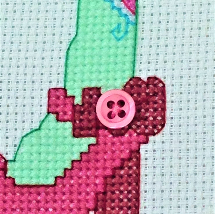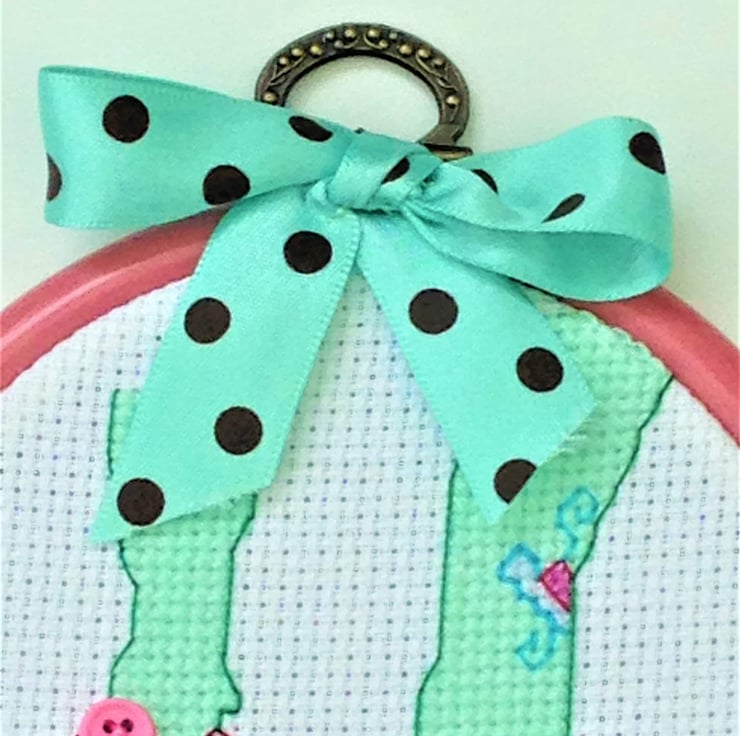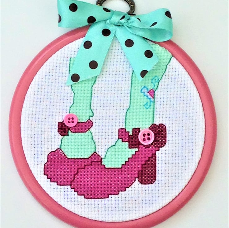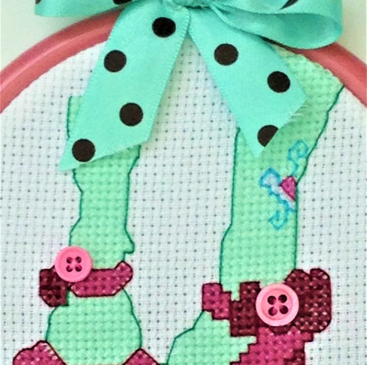 Original cross stitch design of someones legs wearing funky Green tights in Pink shoes with button detailing in a dark pink embroidery hoop with a spotty ribbon decoration.