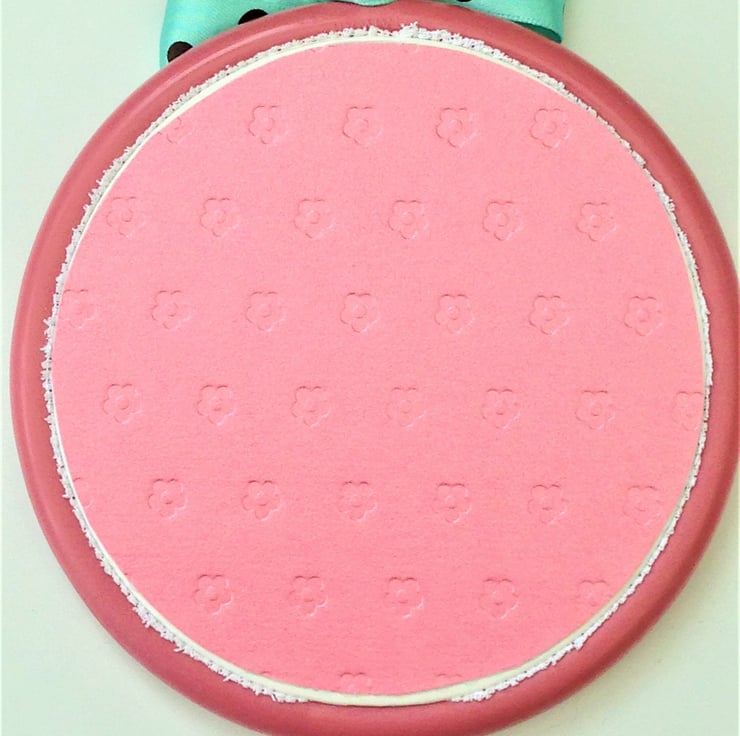 Backed with pink floral detail card to protect the stitching.