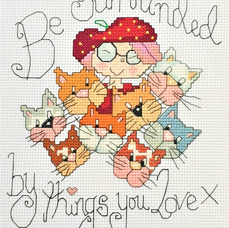 Original cross stitch illustration design of a quirky lady surrounded by cats and 'Be Surrounded by things you love' wording in a PDF format chart for instant download.