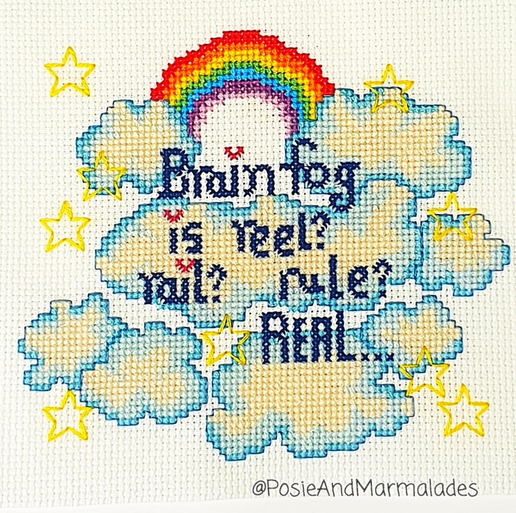 Original cross stitch design of Clouds, Stars and a Rainbow with a quote about Brain Fog in PDF format for instant download.