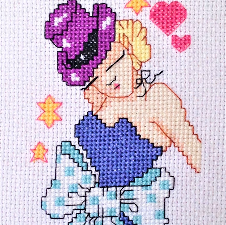 Original cross stitch design of a Rockabilly burlesque style woman in a top hat with star and heart details in PDF format for instant download chart.