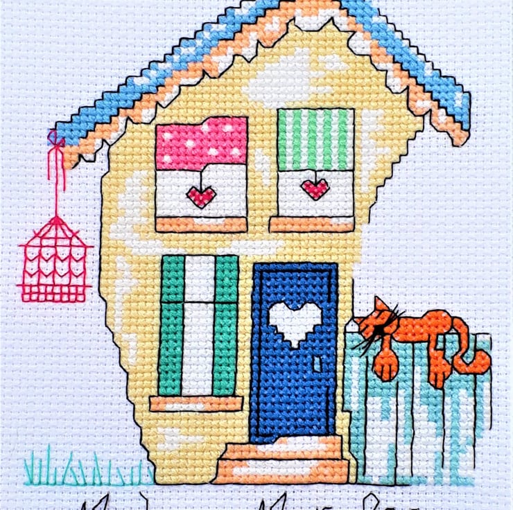 Original cross stitch chart design of a crooked house with a cat on a fence and the wording 'My home, My rules' in PDF format for instant download.