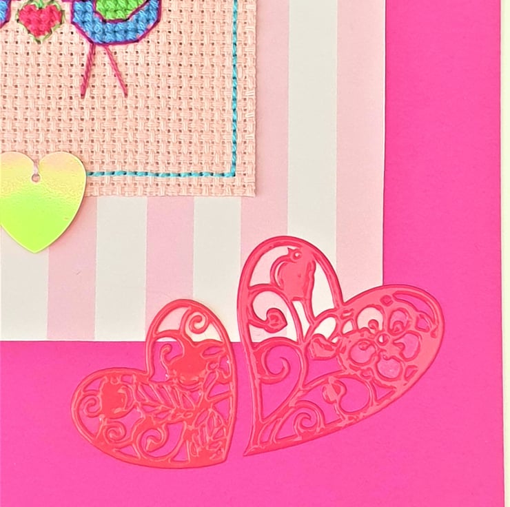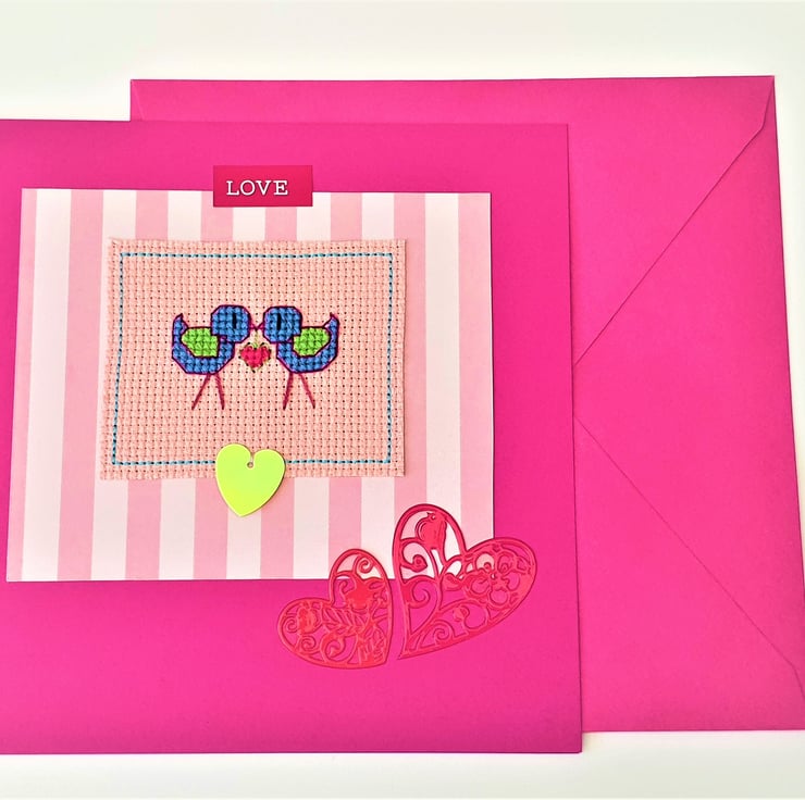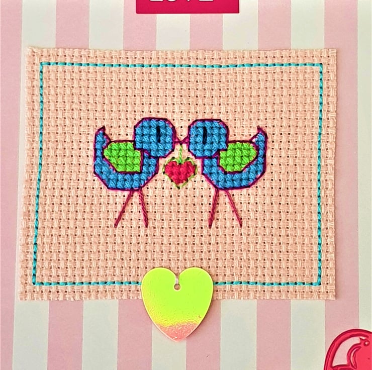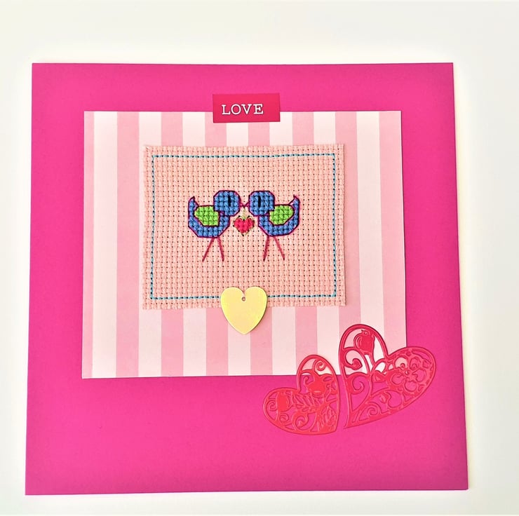 A hand made card, featuring an original cross stitch design of love birds holding a heart between them, sequin detail and the wording "Love".