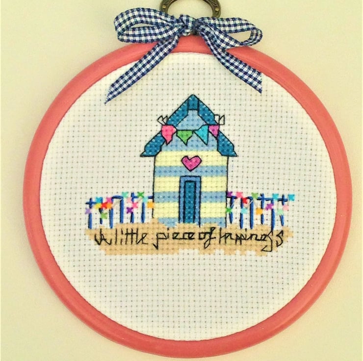 Beach Hut with Bunting and quote cute Cross Stitch hoop decoration