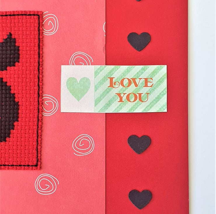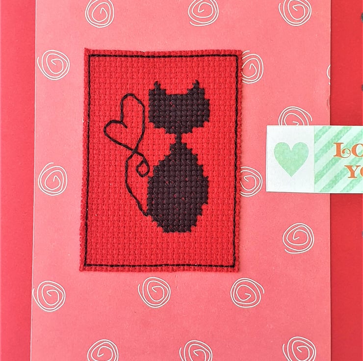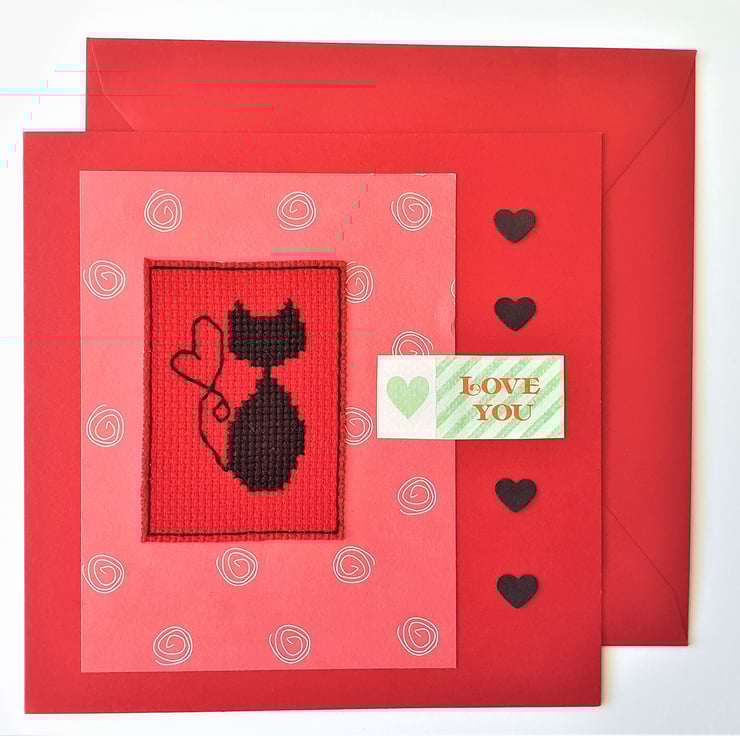 A hand made card, featuring an original cross stitch design of a black cat with a heart shaped tail and the wording "Love you".