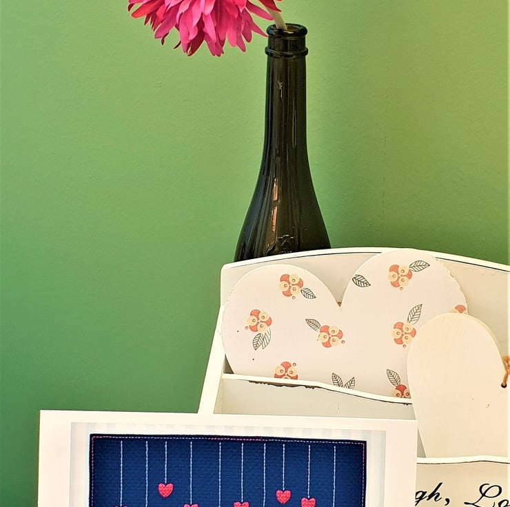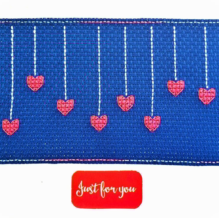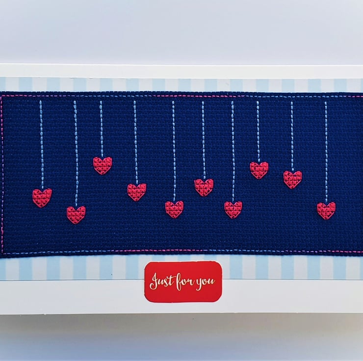 A hand made card, featuring an original Hanging Hearts cross stitch design with the wording 'Just for you'