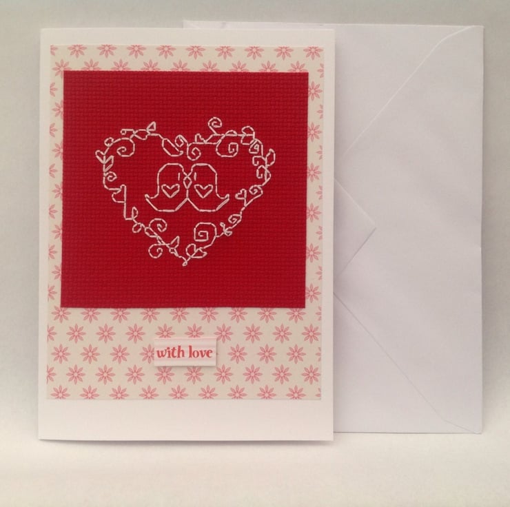 A hand made card, featuring an original cross stitch design of two birds in a heart and the wording "With love".