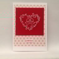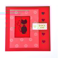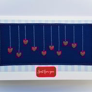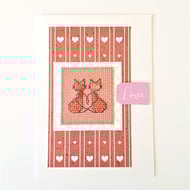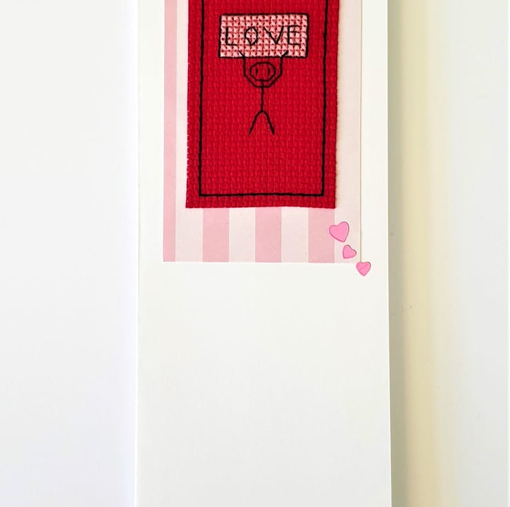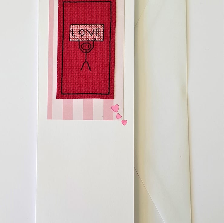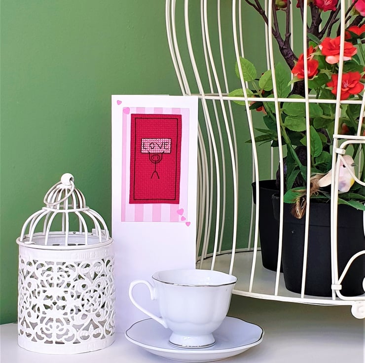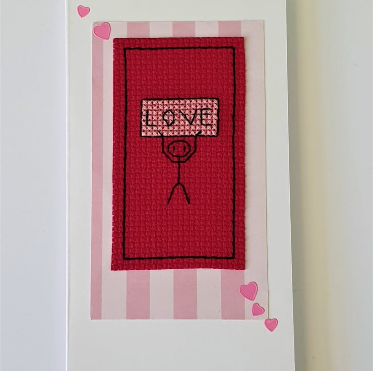 A white card, featuring an original cross stitch design of a little stick man holding up a sign with the wording 'Love' on it and pink hearts detail.