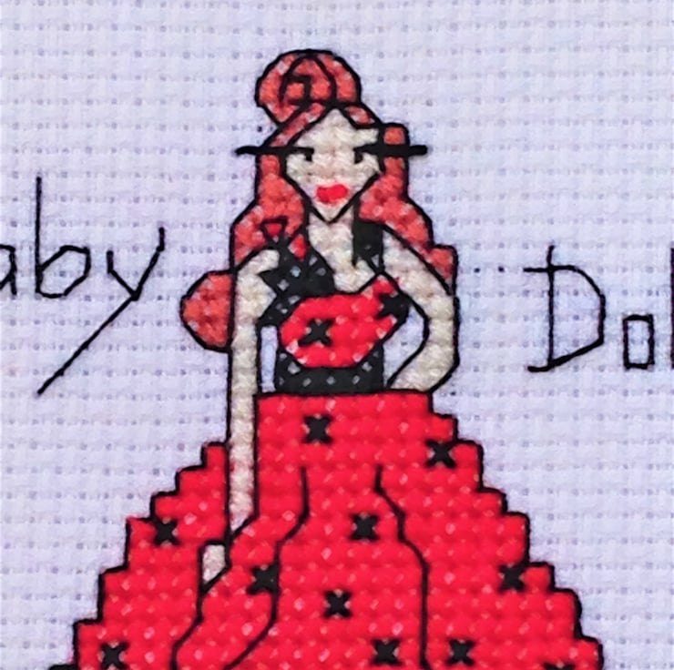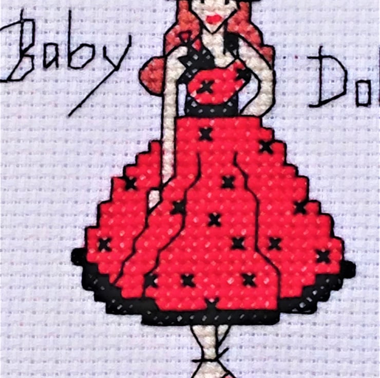 Original small cross stitch design of a Rockabilly style girl with a red and black polka dot 50's style dress with the wording 'Baby Doll' chart in PDF format for instant download.