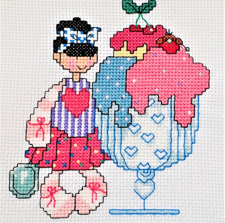 Original quirky cross stitch design of a girl and a huge ice cream sundae in PDF format for instant download.
