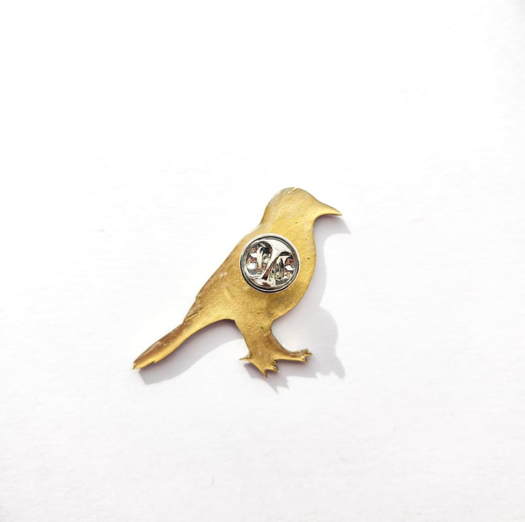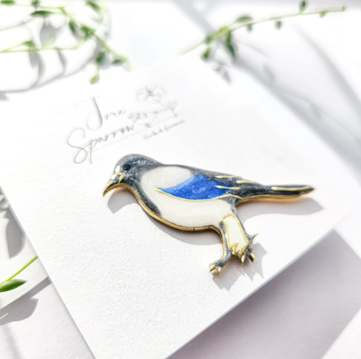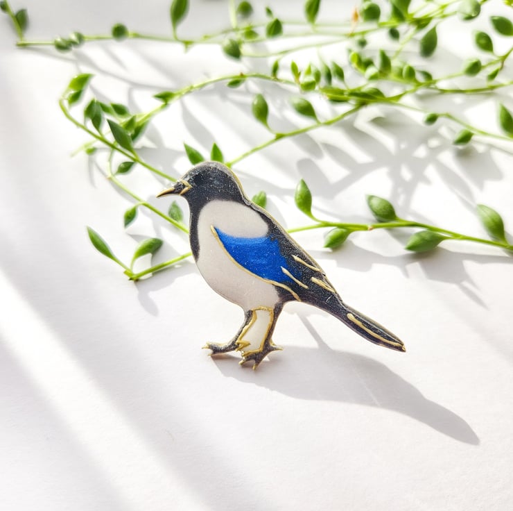 A magpie brooch is hand-shaped, hand-painted and finished with care by hand.