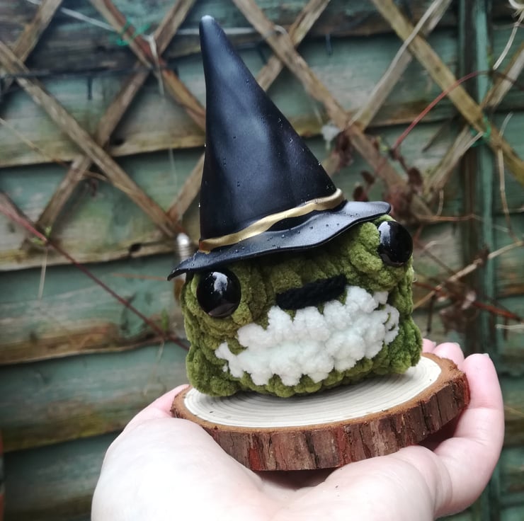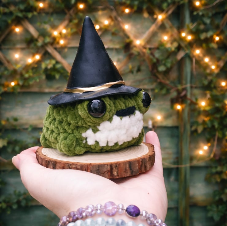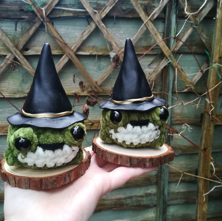 This adorable fat toad is made using a lovely soft yarn. She's is wearing a witches hat and is on a wood slice.