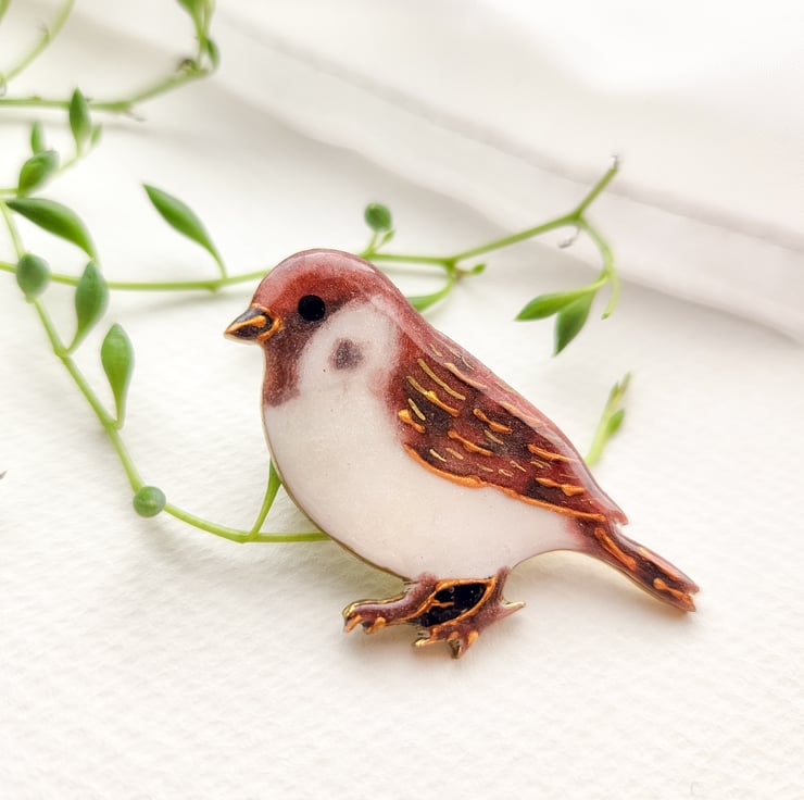 A tree sparrow brooch is hand-shaped, hand-painted and finished with care by hand.