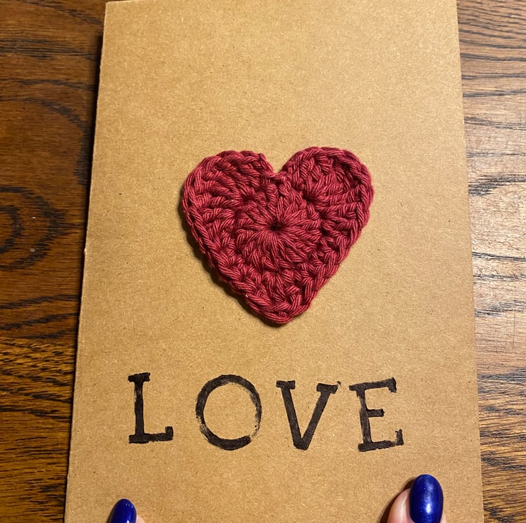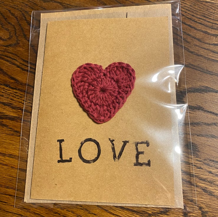 Approximately A6 size, on 280gsm Kraft card. With a hand crocheted heart on the front made from Ricorumi 100% cotton in a classic burgundy. Hand stamped with the word “LOVE”.