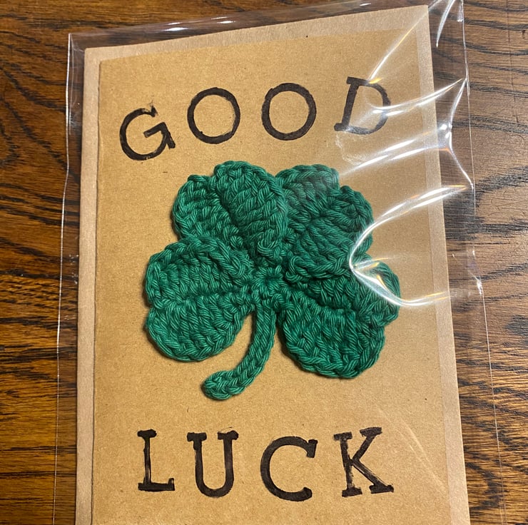 Approximately A6 size, on 280gsm Kraft card. With a hand crocheted four-leaf clover on the front made from Ricorumi 100% cotton in a grass green. Hand stamped with the words “GOOD LUCK”.